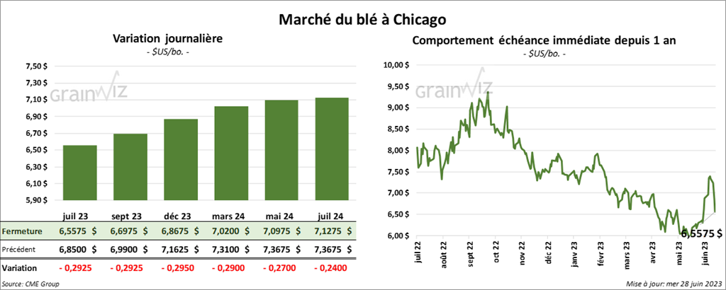 À Chicago, le contrat juil. 23 a fini à 6,5575 $ (- 29 ¼ cents). Celui sept. 23 a terminé à 6,6975 $ (- 29 ¼ cents). Celui déc. 23 a clôturé à 6,8675 $ (- 29 ½ cents). À Kansas, le contrat de blé dur rouge juil. 23 a fermé à 8,0060 $ (- 37 cents). Celui sept. 23 a fini à 8,0560 $ (- 33 ¾ cents). Celui déc. 23 a clôturé à 8,0820 $ (- 32 ¼ cents). À Minneapolis, le contrat de blé de printemps juil. 23 a terminé à 8,0360 $ (- 29 ½ cents). Celui sept. 23 a fini à 8,1820 $ (- 27 cents). Celui déc. 23 a fermé à 8,2760 $ (- 26 cents).