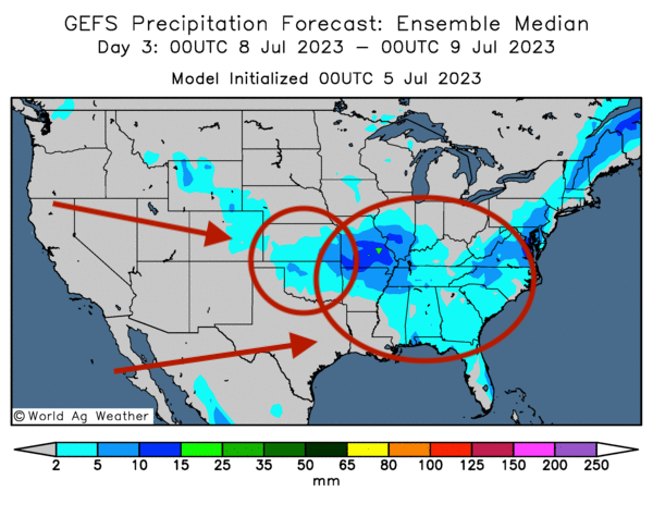 À plus long terme, jusqu’à la mi-juillet, World Weather anticipe plusieurs épisodes de pluie dans le centre US. Ces averses pourraient également affecter le bas Midwest.