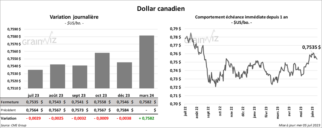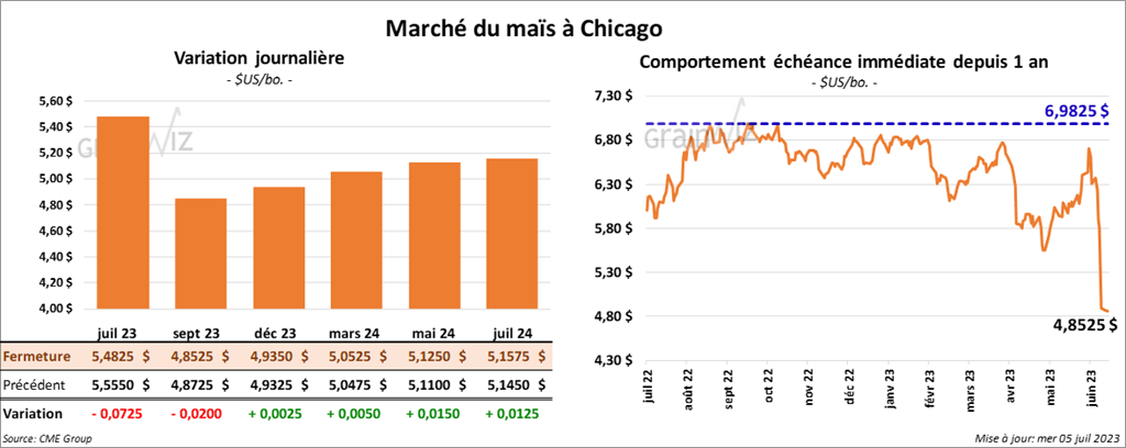 Le contrat de maïs US juil. 23 a terminé la journée à 5,4825 $ (- 7 ¼ cents). Celui sept. 23 a fini à 4,8525 $ (- 2 cents). Celui déc. 23 a fermé à 4,9350 $ (+ ¼ cent).