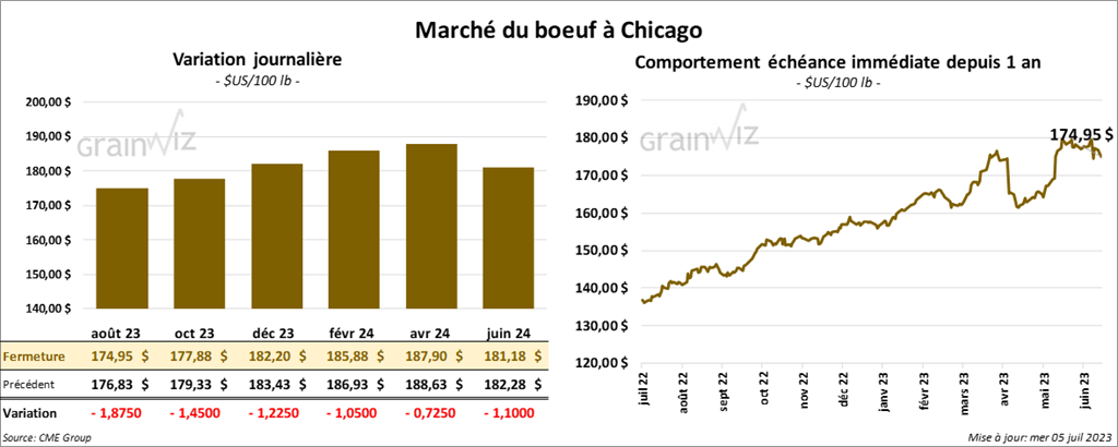 Le contrat de bœuf US août 23 a clôturé à 174,95 $ (- 1,87 $). Celui oct. 23 a fermé à 177,88 $ (- 1,45 $). Celui déc. 23 a terminé à 182,20 $ (- 1,22 $). Quant au veau US, le contrat août 23 a fini à 244,700 $ (- 3,20 $). Celui sept. 23 a clôturé à 248,150 $ (- 3,22 $). Celui oct. 23 a terminé à 249,900 $ (- 3,25 $).