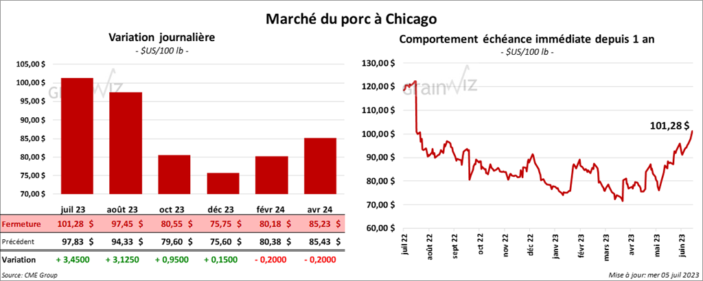 Le contrat de porc US juil. 23 a fini à 101,28 $ (+ 3,45 $). Celui août 23 a terminé à 97,45 $ (+ 3,12 $). Celui oct. 23 a clôturé à 80,55 $ (+ 95 cents).