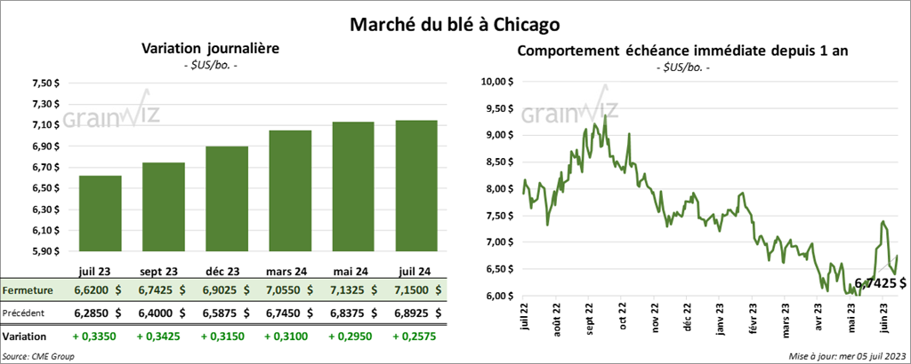 À Chicago, le contrat de blé juil. 23 a clôturé à 6,6200 $ (+ 33 ½ cents). Celui sept. 23 a terminé à 6,7425 $ (+ 34 ¼ cents). Celui déc. 23 a fini à 6,9025 $ (+ 31 ½ cents). À Kansas, le contrat de blé dur rouge juil. 23 a fermé à 8,4920 $ (+ 50 ½ cents). Celui sept. 23 a terminé à 8,4620 $ (+ 49 ¾ cents). Celui déc. 23 a clôturé à 8,4440 $ (+ 45 ¾ cents). Quant à Minneapolis, le contrat de blé de printemps juil. 23 a fini à 8,3440 $ (+ 19 ¼ cents). Celui sept. 23 a fermé à 8,5740 $ (+ 48 ¼ cents). Celui déc. 23 a terminé à 8,6340 $ (+ 45 ¼ cents).