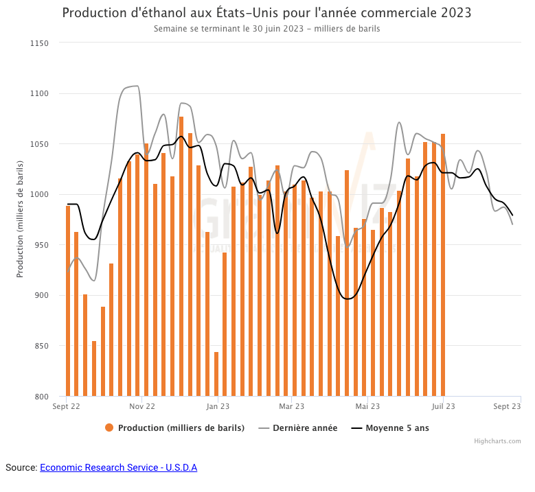 Durant la semaine du 30 juin dernier, la production moyenne d’éthanol US a été de 1,060 million de barils par jour, ce qui était une hausse de 0,8 % comparativement à la semaine précédente et une augmentation de 1,5 % par rapport à l’an dernier. Un total de 7,420 millions de barils d’éthanol US a été produit au cours de la semaine. 106,54 millions de boisseaux de maïs ont été utilisés dans la fabrication de l’éthanol US.