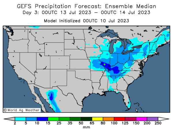 - Cette carte US, fournie par World Ag Weather et dessinée pour les 3 prochains jours, montre notamment des averses possibles dans plusieurs parties du Midwest (voir les zones en bleu).