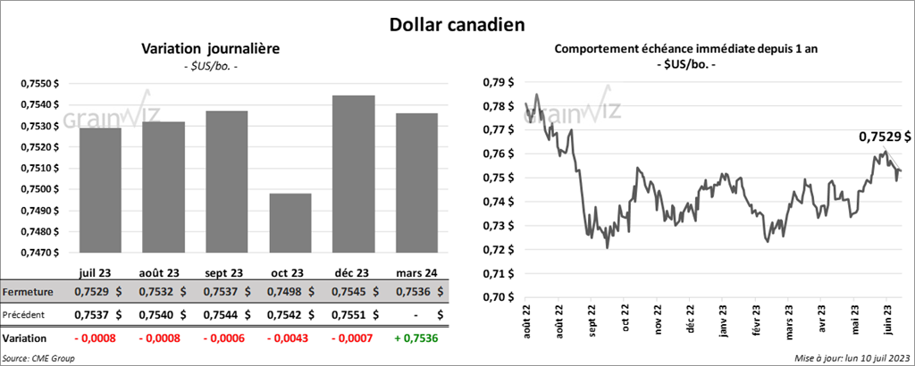 Le contrat de soya US juil. 23 a terminé à 15,0800 $ (+ 22 ½ cents). Celui août 23 a fermé à 14,5550 $ (+ 27 ¾ cents). Celui sept. 23 a fini à 13,6575 $ (+ 27 cents). Quant au tourteau de soya US, le contrat juil. 23 a clôturé à 412,30 $/tonne (+ 2,70 $/tonne). Celui août 23 a terminé à 405,80 $/tonne (+ 3,00 $/tonne). Celui sept. 23 a fini à 398,40 $/tonne (+ 2,20 $/tonne). Du côté de l’huile de soya US, le contrat juil. 23 a fermé à 69,22 $ (+ 267 points). Celui août 23 a clôturé à 65,33 $ (+ 276 points).