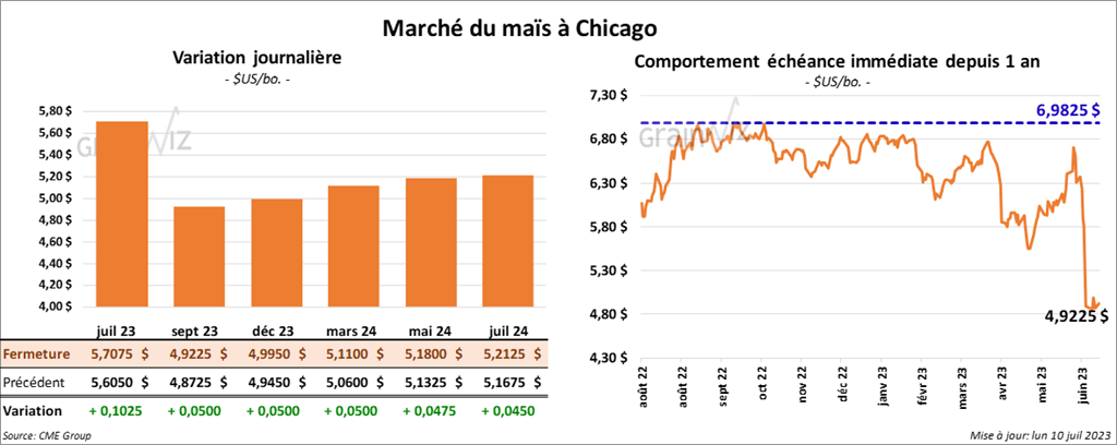 Le contrat de maïs US juil. 23 a terminé à 5,7075 $ (+ 10 ¼ cents). Celui sept. 23 a fini à 4,9225 $ (+ 5 cents). Celui déc. 23 a fermé à 4,9950 $ (+ 5 cents).
