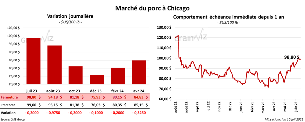 Le contrat de porc US juil. 23 a fermé à 98,80 $ (- 20 cents). Celui août 23 a fini à 94,18 $ (- 97 cents). Celui oct. 23 a terminé à 81,18 $ (- 20 cents).