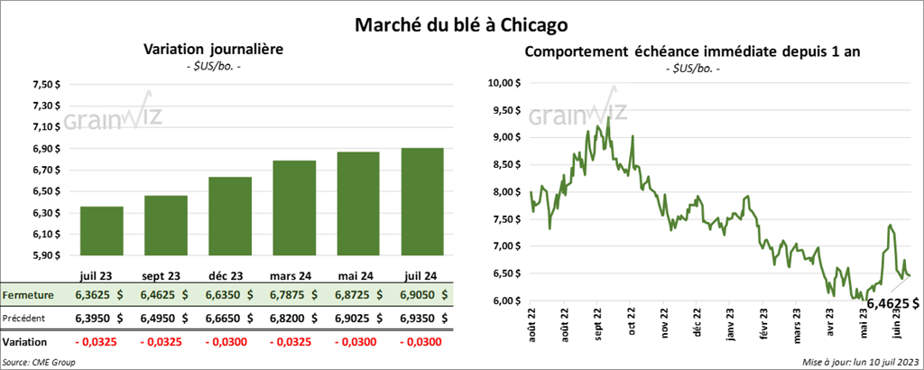 À Chicago, le contrat de blé juil. 23 a terminé à 6,3625 $ (- 3 ¼ cents). Celui sept. 23 a clôturé à 6,4625 $ (- 3 ¼ cents). Celui déc. 23 a fini à 6,6350 $ (- 3 cents). À Kansas, le contrat de blé dur rouge juil. 23 a terminé à 8,1040 $ (-7 cents). Celui sept. 23 a fini à 8,1120 $ (- 7 cents). Celui déc. 23 a clôturé à 8,1420 $ (- 5 ¼ cents). À Minneapolis, le contrat de blé de printemps juil. 23 a fermé à 8,3840 $ (- 10 cents). Celui sept. 23 a fini à 8,5020 $ (+ 2 ½ cents). Celui déc. 23 a terminé à 8,5660 $ (+ 2 ¼ cents).