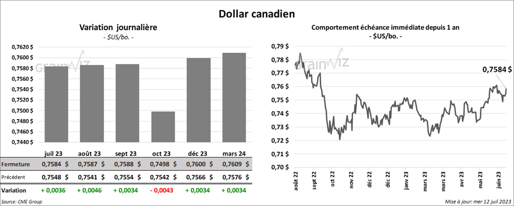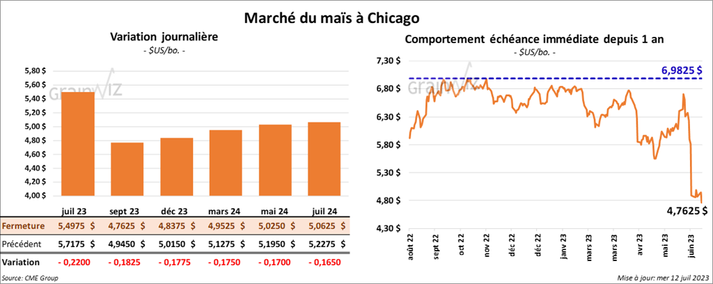 Le contrat de maïs US juil. 23 a terminé à 5,4975 $ (- 22 cents). Celui sept. 23 a fini à 4,7625 $ (- 18 ¼ cents). Celui déc. 23 a fermé à 7,8375 $ (- 17 ¾ cents).