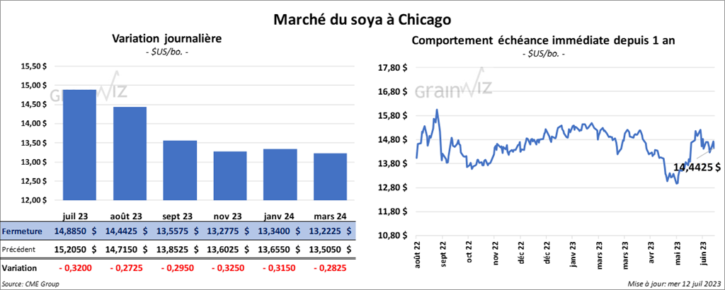 Le contrat de soya US juil. 23 a clôturé à 14,8850 $ (- 32 cents). Celui août 23 a terminé à 14,4425 $ (- 27 ¼ cents). Celui sept. 23 a fini à 13,5575 $ (- 29 ½ cents). Quant au tourteau de soya US, le contrat juil. 23 a fermé à 421,40 $/tonne (- 90 cents/tonne). Celui août 23 a terminé à 410,90 $/tonne (- 5,30 $/tonne). Celui sept. 23 a clôturé à 401,70 $/tonne (- 6,90 $/tonne). Du côté de l’huile de soya US, le contrat juil. 23 a terminé à 68,68 $ (+ 15 points). Celui août 23 a fermé à 64,34 $ (- 29 points).