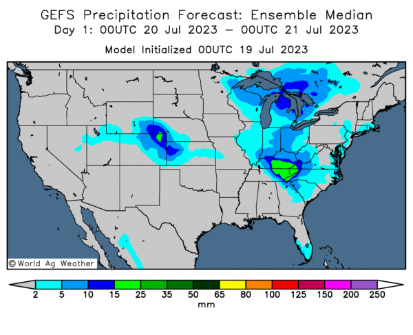 - Pour aujourd’hui, le NOAA prévoyait des averses dans le haut Midwest, le nord des Plaines US et certaines parties de l’est du Midwest (Corn Belt).