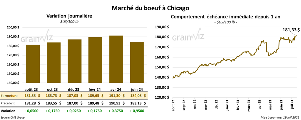 Le contrat de bœuf US août 23 a fermé à 181,53 $ (+ 5 cents). Celui oct. 23 a terminé à 183,73 $ (+ 17 ½ cents). Celui déc. 23 a fini à 187,03 $ (+ 2 cents). Quant au veau US, le contrat août 23 a clôturé à 246,800 $ (- 1,20 $). Celui sept. 23 a fermé à 249,325 $ (+ 67 cents). Celui oct. 23 a terminé à 250,550 $ (- 52 cents).