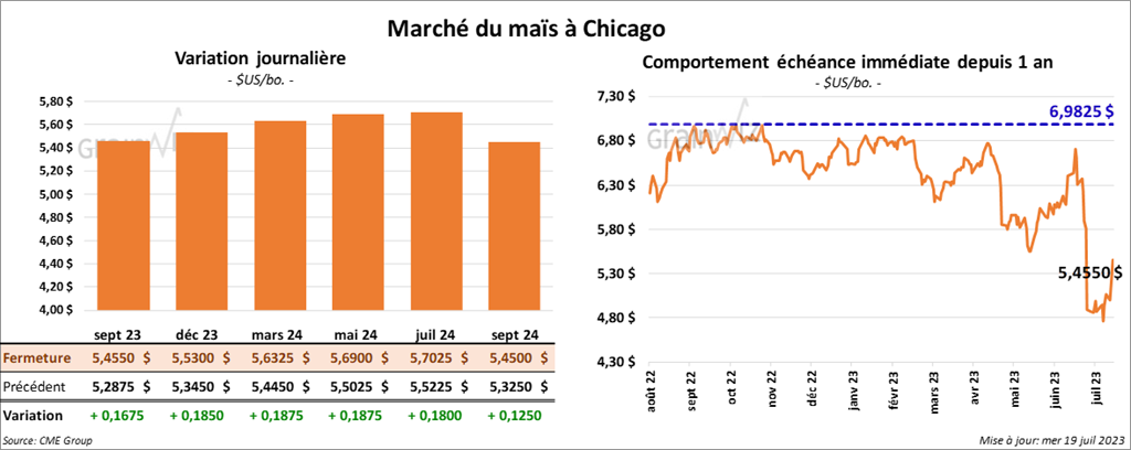 Le contrat de maïs US sept 23 a clôturé à 5,4550 $ (+ 16 ¾ cents). Celui déc. 23 a terminé à 5,5300 $ (+ 18 ½ cents). Celui mars 24 a fermé à 5,6325 $ (+ 18 ¾ cents).