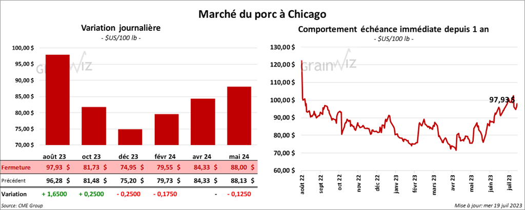 Le contrat de porc US août 23 a fini à 97,93 $ (+ 1,60 $). Celui oct. 23 a clôturé à 81,73 $ (+ 25 cents). Celui déc. 23 a fermé à 74,95 $ (- 25 cents).