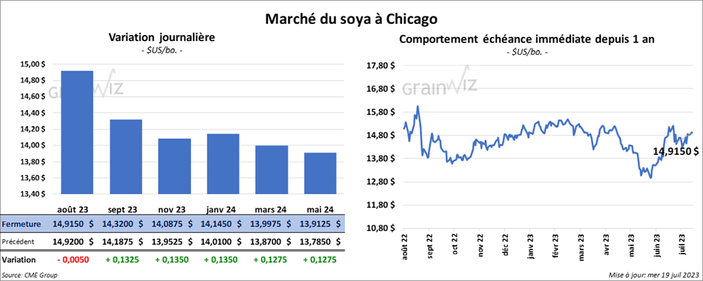 Le contrat de soya US août 23 a clôturé à 14,9150 $ (- ½ cent). Celui sept. 23 a fermé à 14,3200 $ (+ 13 ¼ cents). Celui nov. 23 a terminé à 14,0875 $ (+ 13 ½ cents). Quant au tourteau de soya US, le contrat août 23 a fini à 443,80 $/tonne (+ 1,10 $/tonne). Celui sept. 23 a clôturé à 429,30 $/tonne (+ 20 cents/tonne). Celui oct. 23 a fermé à 417,40 $/tonne (- 1,10 $/tonne). Du côté de l’huile de soya US, le contrat août 23 a terminé à 66,05 $ (+ 200 points). Celui sept. 23 a fini à 62,08 $ (+ 168 points).