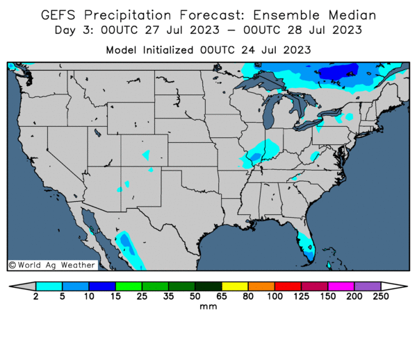 - Cette carte US, fournie par World Ag Weather et dessinée pour les 3 prochains jours, montre très peu de précipitations possibles à la grandeur du territoire US.