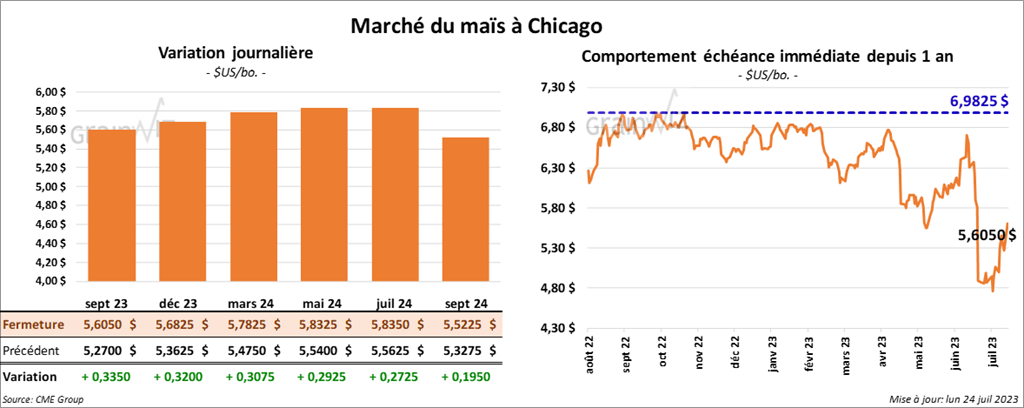 Le contrat de maïs sept. 23 a clôturé à 5,6050 $ (+ 33 ½ cents). Celui déc. 23 a fermé à 5,6825 $ (+ 32 cents). Celui mars 24 a terminé à 5,7825 (+ 30 ¾ cents).