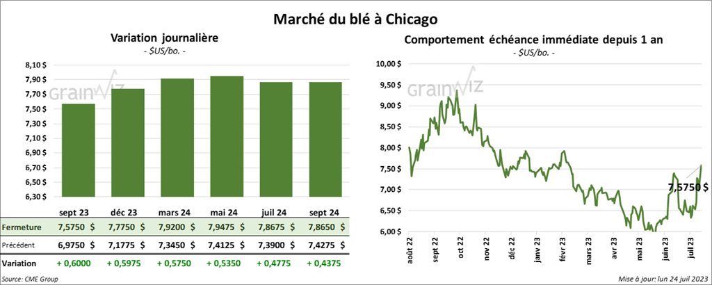 À Chicago, le contrat de blé sept. 23 a clôturé à 7,5750 $ (+ 60 cents). Celui déc. 23 a fermé à 7,7750 $ (+ 59 ¾ cents). Celui mars 24 a terminé à 7,9200 $ (+ 57 ½ cents). À Kansas, le contrat de blé dur rouge sept. 23 a fini à 9,1840 $ (+ 58 ¼ cents). Celui déc. 23 a clôturé à 9,2520 $ (+ 58 ½ cents). Celui mars 24 a fermé à 9,1840 $ (+ 57 ¼ cents). À Minneapolis, le contrat de blé de printemps a terminé à 9,3600 $ (+ 49 cents). Celui déc. 23 a fini à 9,4440 $ (+ 48 cents). Celui mars 24 a clôturé à 9,4700 $ (+ 45 ½ cents).