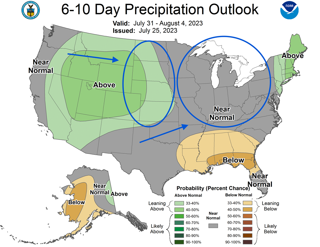 - Cette carte US, fournie par le NOAA et dessinée pour les 6 à 10 prochains jours, indique des précipitations probablement dans la normale pour une bonne partie du Midwest (voir les zones grises). Elle montre aussi des possibilités d’averses au-delà de la normale pour certaines parties des Plaines US (voir les zones vertes).