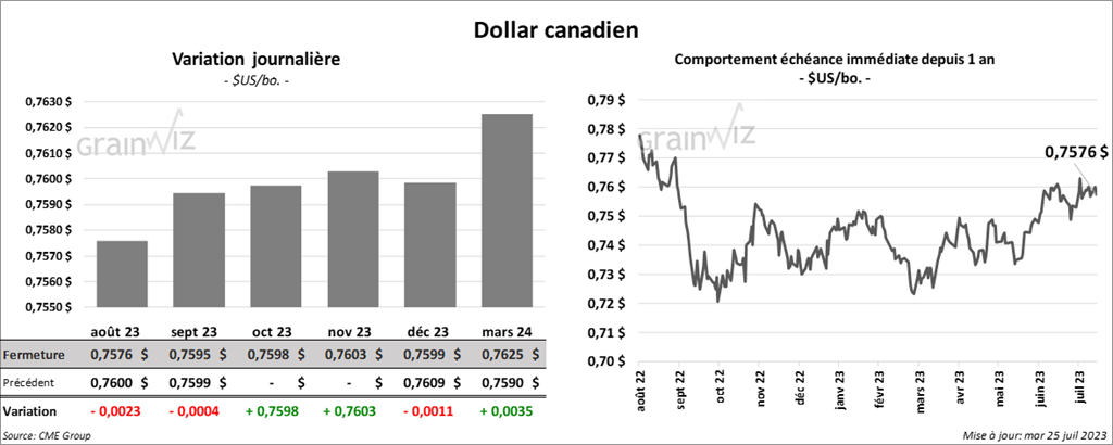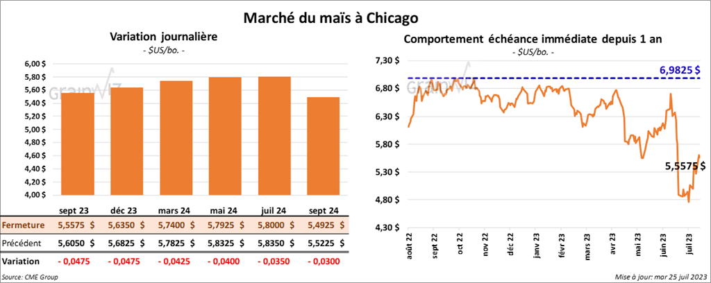 Le contrat de maïs US sept. 23 a clôturé à 5,5575 $ (- 4 ¾ cents). Celui déc. 23 a fermé à 5,6350 $ (- 4 ¾ cents). Celui mars 24 a terminé à 5,7400 $ (- 4 ¼ cents).