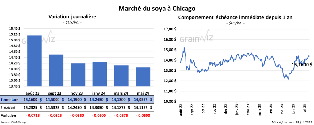 Le contrat de soya US août 23 a clôturé à 15,1600 $ (- 7 ¼ cents). Celui sept. 23 a fermé à 14,5000 $ (- 3 ¼ cents). Celui nov. 23 a terminé à 14,1900 $ (- 5 ½ cents). Quant au tourteau de soya US, le contrat août 23 a fini à 454,00 $/tonne (+ 6,70 $/tonne). Celui sept. 23 a clôturé à 436,50 $/tonne (+ 6,10 $/tonne). Celui oct. 23 a fermé à 419,90 $/tonne (+ 5,00 $/tonne). Du côté de l’huile de soya US, le contrat août 23 a terminé à 72,56 $ (+ 57 points). Celui sept. 23 a fini à 68,348 $ (+ 27 points).