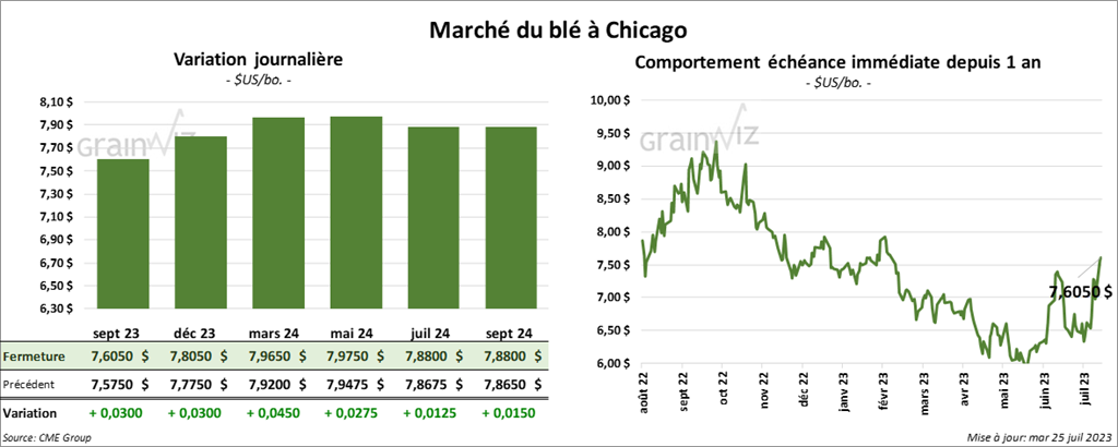 À Chicago, le contrat de blé sept. 23 a clôturé à 7,6050 $ (+ 3 cents). Celui déc. 23 a fermé à 7,8050 $ (+ 3 cents). Celui mars 24 a terminé à 7,9650 $ (+ 4 ½ cents). À Kansas, le contrat de blé dur rouge sept. 23 a fini à 9,1260 $ (- 5 ¾ cents). Celui déc. 23 a clôturé à 9,2060 $ (- 4 ½ cents). Celui mars 24 a fermé à 9,1760 $ (- ¾ cent). À Minneapolis, le contrat de blé de printemps sept. 23 a terminé à 9,3340 $ (- 2 ½ cents). Celui déc. 23 a fini à 9,4200 $ (- 2 ½ cents). Celui mars 24 a clôturé à 9,4940 $ (+ 2 ½ cents).