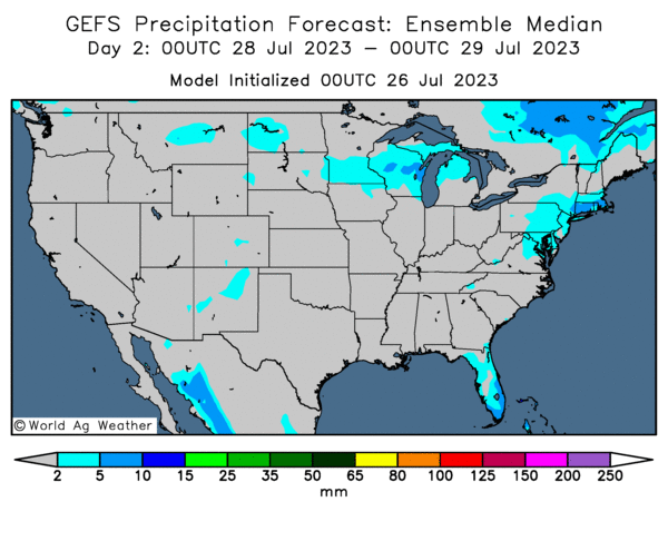- Cette carte US, fournie par World Ag Weather et dessinée pour les 2 prochains jours, montre très peu de précipitations possibles à l’ensemble du territoire US.