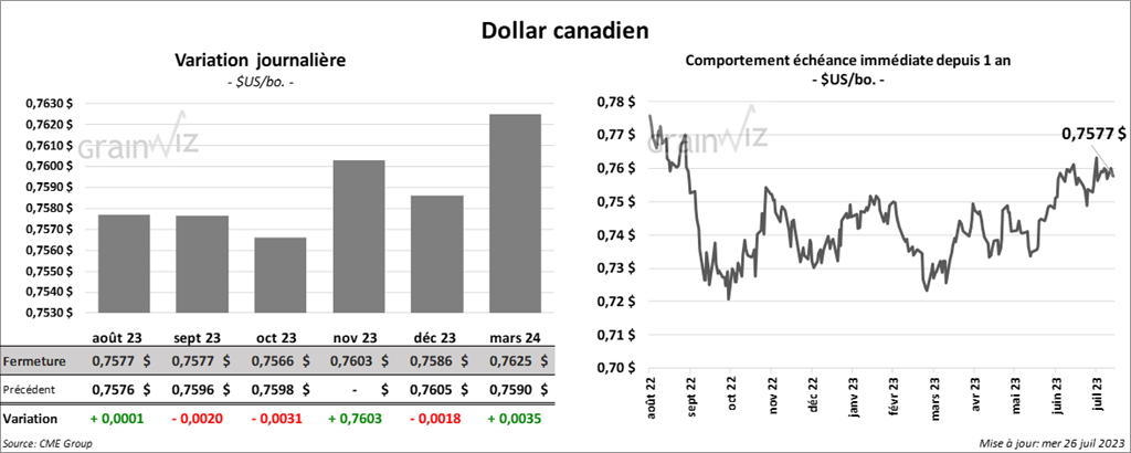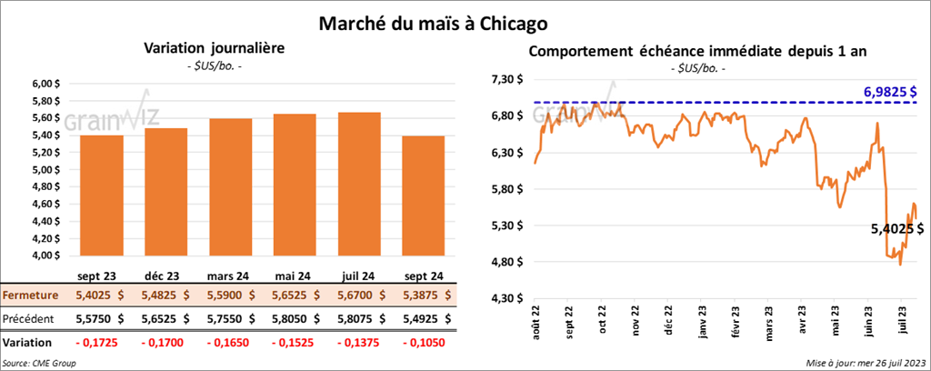 Le contrat de maïs US sept. 23 a clôturé à 5,4025 $ (- 17 ¼ cents). Celui déc. 23 a fermé à 5,4825 $ (- 17 cents). Celui mars 24 a terminé à 5,5900 $ (- 16 ½ cents).
