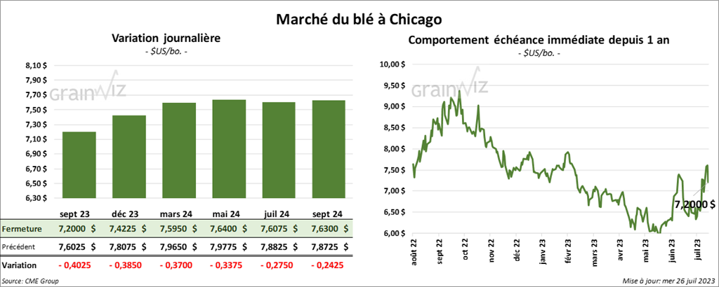 À Chicago, le contrat de blé sept 23 a clôturé à 7,2000 $ (- 40 ¼ cents). Celui déc. 23 a fermé à 7,4225 $ (- 38 ½ cents). Celui mars 24 a terminé à 7,5950 $ (- 37 cents). À Kansas, le contrat de blé dur rouge a fini à 8,6520 $ (- 47 ½ cents). Celui déc. 23 a clôturé à 8,7720 $ (- 43 ½ cents). Celui mars 24 a fermé à 8,7640 $ (- 41 ¼ cents). À Minneapolis, le contrat de blé de printemps sept. 23 a terminé à 8,9560 $ (- 36 ¼ cents). Celui déc. 23 a fini à 9,0740 $ (- 34 ½ cents). Celui mars 24 a clôturé à 9,1600 $ (- 32 ¼ cents).