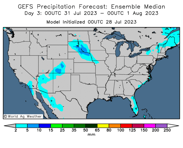 - Cette carte US, fournie par World Ag Weather et dessinée pour les 3 prochains jours, montre très peu de précipitations probables à l’ensemble du territoire US.