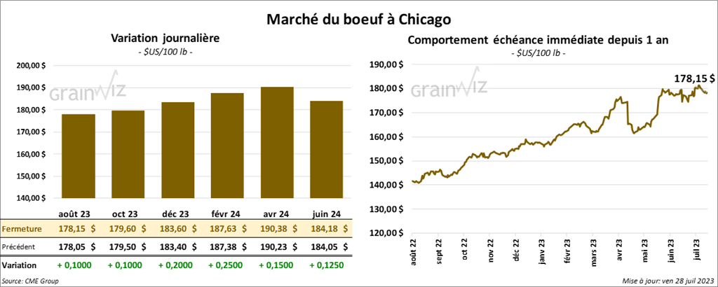 Le contrat de bœuf US août 23 a clôturé à 178,15 $ (+ 10 cents). Celui oct. 23 a fermé à 179,60 $ (+ 10 cents). Celui déc. 23 a terminé à 183,60 $ (+ 20 cents). Quant au veau US, le contrat août 23 a fini à 245,600 $ (+ 95 cents). Celui sept. 23 a clôturé à 248,975 $ (+ 70 cents). Celui oct. 23 a fermé à 251,000 $ (+ 65 cents).