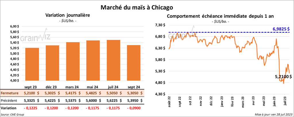 Le contrat de maïs US sept. 23 a clôturé à 5,2100 $ (- 12 ¼ cents). Celui déc. 23 a fermé 5,3025 $ (- 12 cents). Celui mars 24 a terminé à 5,4175 $ (- 12 cents).