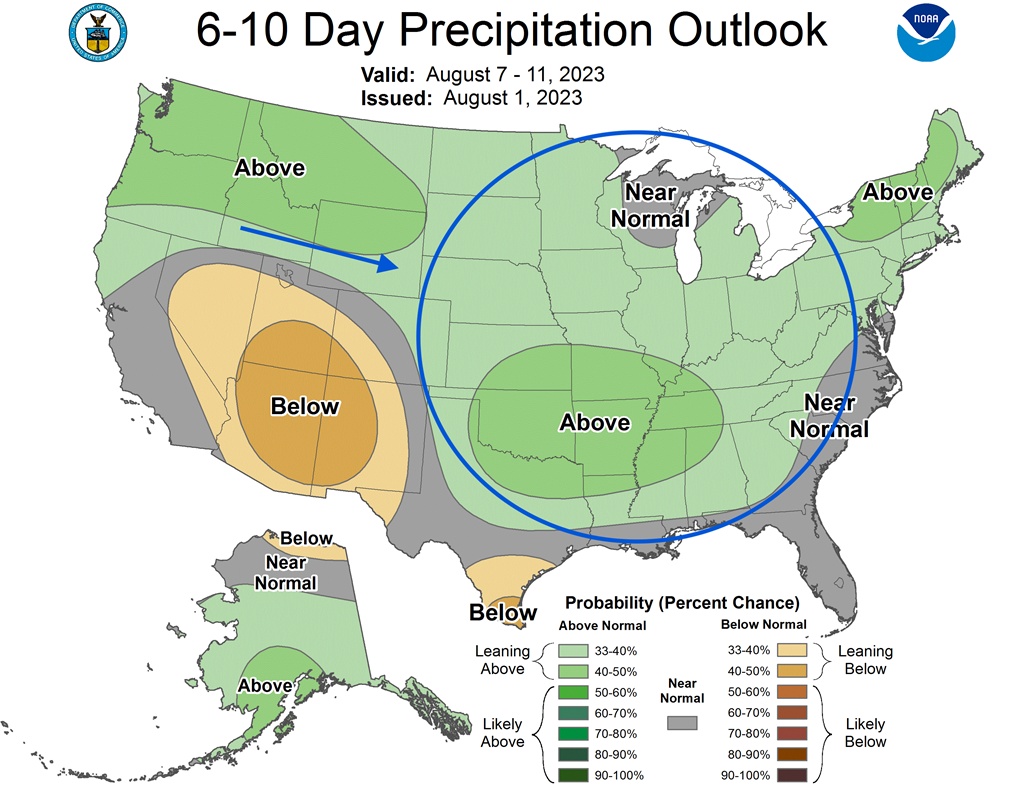 - Cette carte US, fournie par le NOAA et dessinée pour les 6 à 10 prochains jours, montre des précipitations possibles pour une bonne partie des Plaines US et du Midwest.