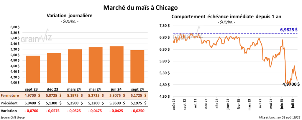 Le contrat de maïs US sept. 23 a clôturé à 4,9700 $ (- 7 cents). Celui déc. 23 a fermé à 5,0725 $ (- 5 ¾ cents). Celui mars 24 a terminé à 5,1975 $ (- 5 ¼ cents).