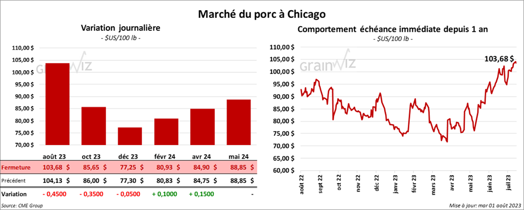Le contrat de porc US août 23 a clôturé à 103,68 $ (- 45 cents). Celui oct. 23 a fermé à 85,65 $ (- 35 cents). Celui déc. 23 a terminé à 77,25 $ (- 5 cents).