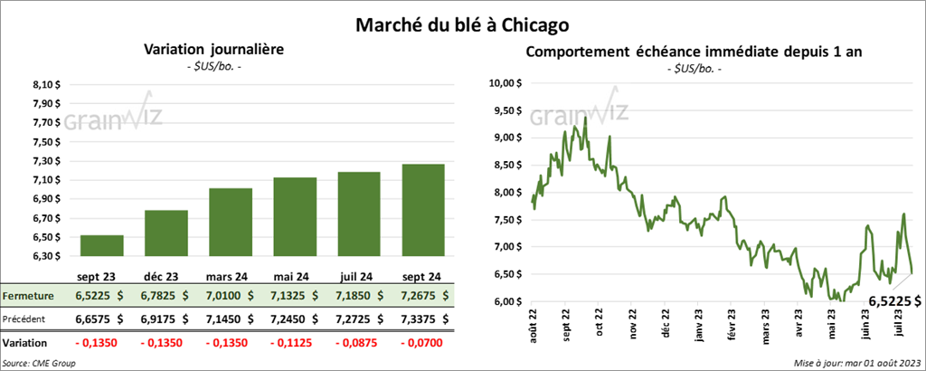 À Chicago, le contrat de blé sept. 23 a clôturé à 6,5225 $ (- 13 ½ cents). Celui déc. 23 a fermé à 6,7825 $ (-13 ½ cents). Celui mars 24 a terminé à 7,0100 $ (-13 ½ cents). À Kansas, le contrat de blé dur rouge sept. 23 a fini à 8,0440 $ (- 8 ¼ cents). Celui déc. 23 a clôturé à 8,1760 $ (-11 ¾ cents). Celui mars 24 a fermé à 8,2220 $ (- 11 ¼ cents). À Minneapolis, le contrat de blé de printemps sept. 23 a terminé à 8,5460 $ (- 1,00 $). Celui déc. 23 a fini à 8,6940 $ (0,0 cent). Celui mars 24 a clôturé à 8,7800 $ (- 1,00 $).