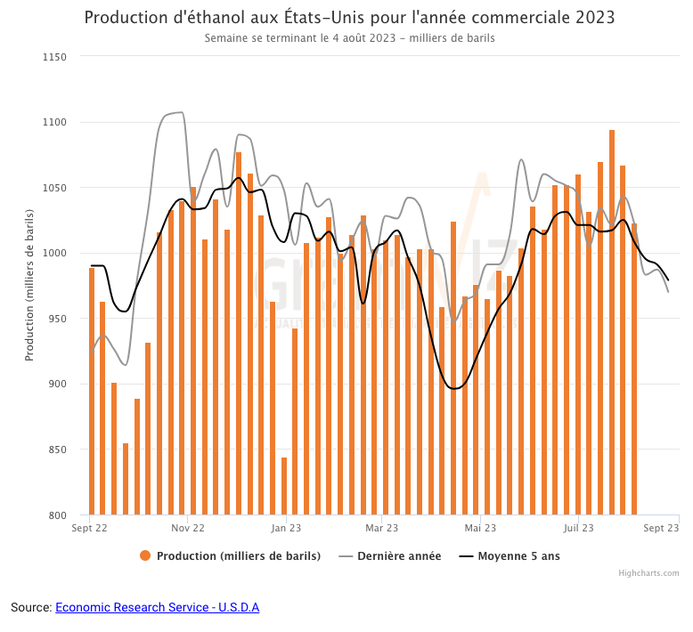 Au cours de la semaine du 4 août dernier, la production moyenne d’éthanol US a été de 1,023 million de barils par jour, ce qui était une baisse de 4,1 % comparativement à la semaine précédente et une réduction de 0,1 % par rapport à l’an dernier. Au total, 7,161 millions de barils d’éthanol US ont été produits au cours de la semaine. 102,82 millions de boisseaux de maïs ont été utilisés dans la fabrication de l’éthanol US.