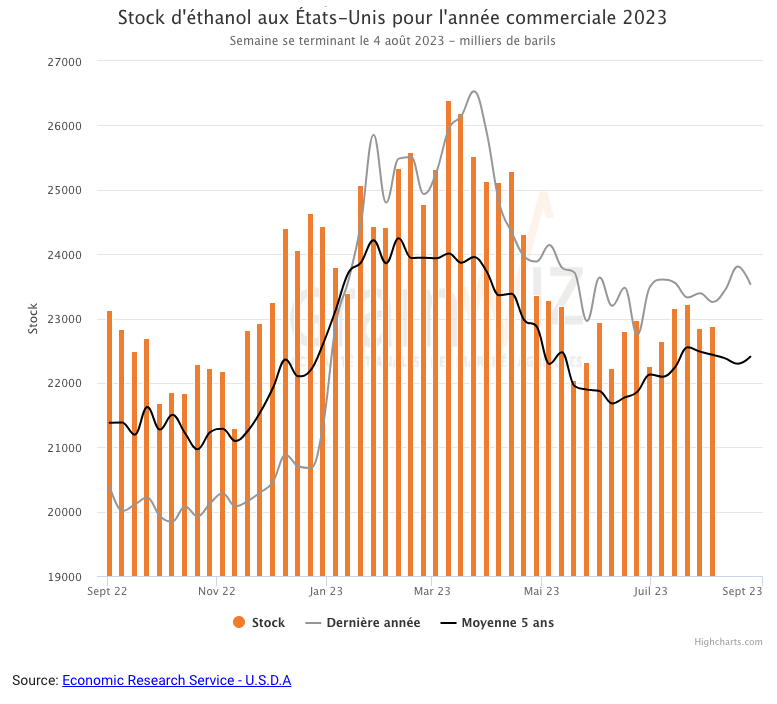 Quant aux inventaires d’éthanol US, ils ont été établis à 22,880 millions de barils, soit à une augmentation de 0,1 % comparativement à la semaine précédente et à une baisse de 1,6 % par rapport à l’an dernier.