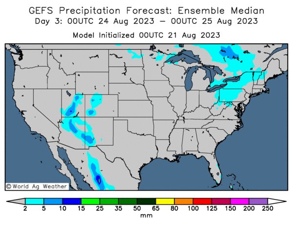 - Cette carte US, fournie par World Ag Weather et dessinée pour les 3 prochains jours, n’indique pratiquement pas de possibilité de pluie pour les Plaines US et le Midwest.
