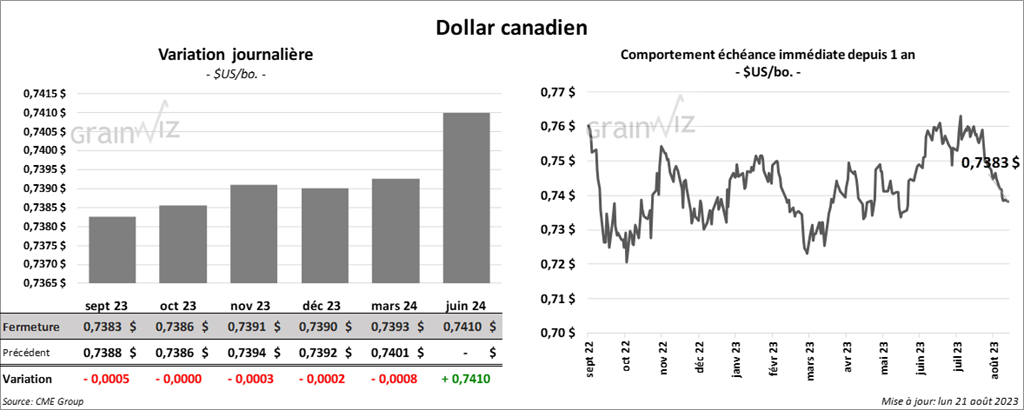 Le contrat de maïs US sept. 23 a clôturé à 4,6925 $ (- 10 ¼ cents). Celui déc. 23 a fermé à 4,8250 $ (- 10 ½ cents). Celui mars 24 a terminé à 4,9675 $ (- 9 ¾ cents).