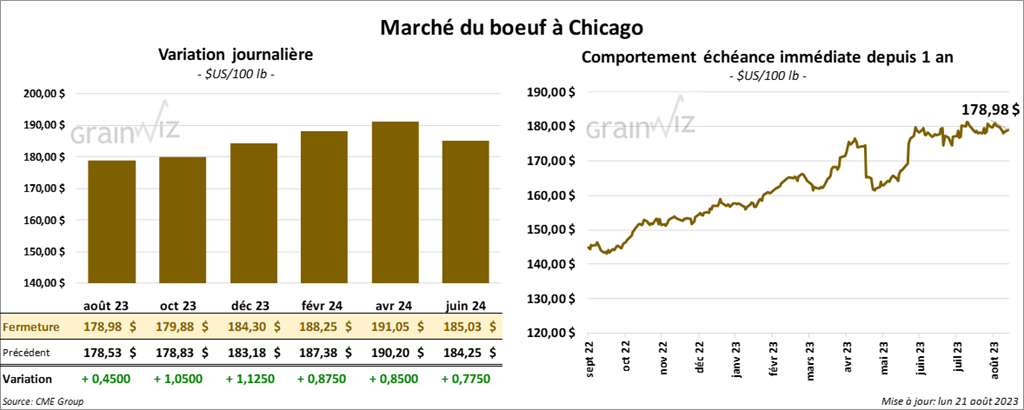 Le contrat de bœuf US août 23 a clôturé à 178,98 $ (+ 45 cents). Celui oct. 23 a fermé à 179,88 $ (+ 1,05 $). Celui déc. 23 a terminé à 184,30 $ (+ 1,12 $). Quant au veau US, le contrat août 23 a fini à 246,775 $ (+ 1,20 $). Celui sept. 23 a clôturé à 250,325 $ (+ 1,80 $). Celui oct. 23 a fermé à 252,650 $ (+ 1,95 $).