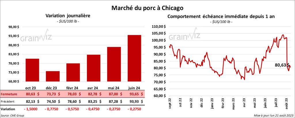 Le contrat de porc US oct. 23 a clôturé à 88,63 $ (- 1,50 $). Celui déc. 23 a fermé à 73,73 $ (- 77 cents). Celui févr. 24 a terminé à 78,03 $ (- 57 cents).