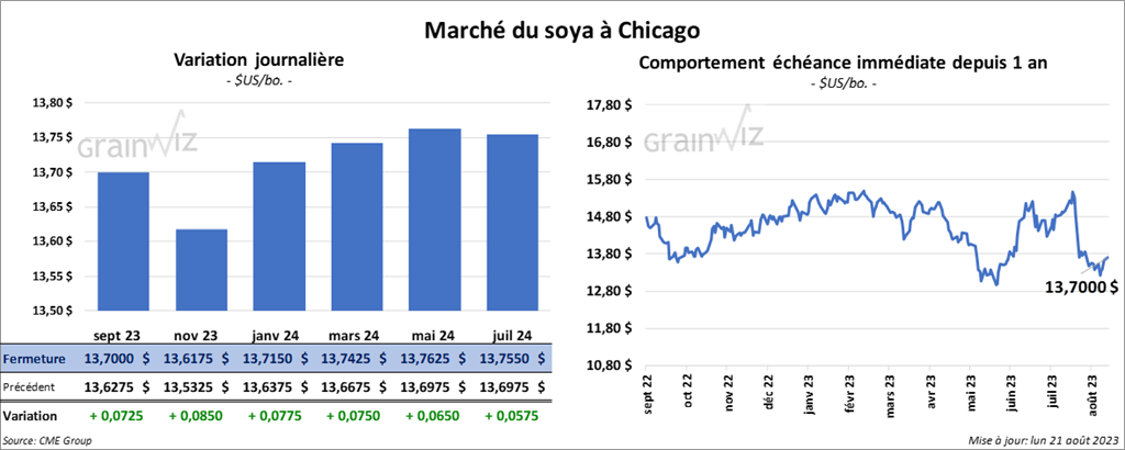 Le contrat de soya US sept. 23 a clôturé à 13,7000 $ (+ 7 ¼ cents). Celui nov. 23 a fermé à 13,6175 $ (+ 8 ½ cents). Celui janv. 24 a terminé à 13,7150 $ (+ 7 ¾ cents). Quant au tourteau de soya US, le contrat sept. 23 a fini à 4,0980 $/tonne (+ 5,90 $/tonne). Celui oct. 23 a clôturé à 3,9930 $/tonne (+ 6,60 $/tonne). Celui déc. 23 a fermé à 3,9650 $ (+ 7,50 $/tonne). Du côté de l’huile de soya US, le contrat sept. 23 a terminé à 67,99 $ (- 30 points). Celui oct. 23 a fini à 65,60 $ (- 27 points).