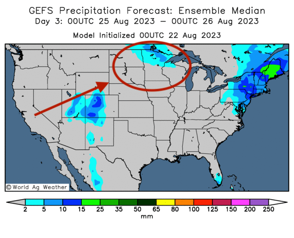 - Cette carte US, fournie par World Ag Weather et dessinée pour les 3 prochains jours, n’indique pas de précipitations possibles pour les Plaines US et le Midwest. Le nord du Minnesota, certaines parties du Dakota du Nord et du Wiconsin sont peut-être l’exception avec des averses légères (voir les zones bleues).