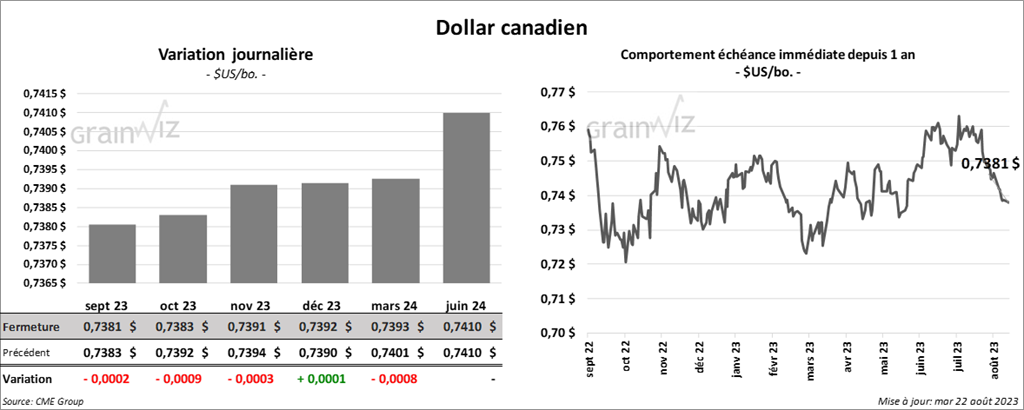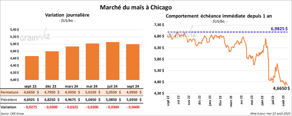 Le contrat de maïs US sept. 23 a clôturé à 4,6650 $ (- 2 ¾ cents). Celui déc. 23 a fermé à 4,7950 $ (- 3 cents). Celui mars 24 a terminé à 4,9350 $ (- 3 ¼ cents).