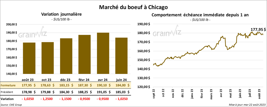 Le contrat de bœuf US août 23 a clôturé à 177,95 $ (- 1,02 $). Celui oct. 23 a fermé à 178,63 $ (- 1,25 $). Celui déc. 23 a terminé à 183,15 $ (- 1,15 $). Quant au veau US, le contrat août 23 a fini à 245,500 $ (- 1,27 $). Celui sept. 23 a clôturé à 249,000 $ (- 1,32 $). Celui oct. 23 a fermé à 251,225 $ (- 1,42 $).