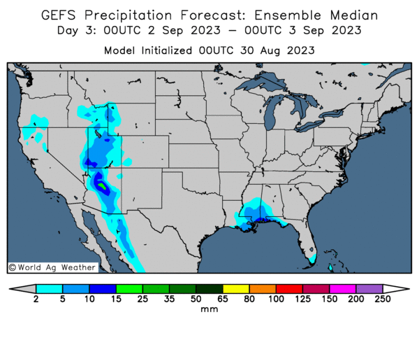 - Cette carte US, fournie par World Ag Weather et dessinée pour les 3 prochains jours, ne montre pas de signe probable de pluie pour les Plaines US et le Midwest.