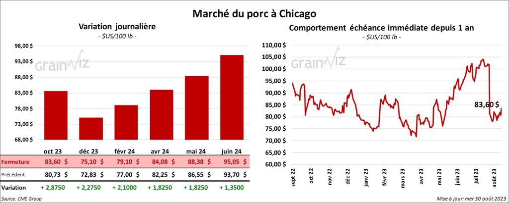 Le contrat de porc US oct. 23 a clôturé è 83,60 $ (+ 2,88 $). Celui déc. 23 a fermé à 75,10 $ (+ 2,27 $). Celui févr. 24 a terminé à 79,10 $ (+ 2,10 $).