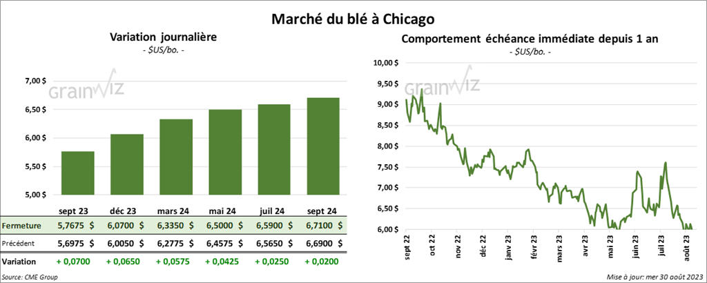 À Chicago, le contrat de blé sept. 23 a clôturé à 5,7675 $ (+ 7 cents). Celui déc. 23 a fermé à 6,0700 $ (+ 6 ½ cents). Celui mars 24 a terminé à 6,3300 $ (+ 6 ¾ cents). À Kansas, le contrat de blé dur rouge d’hiver a fini à 7,1920 $ (+ 4 ¾ cents). Celui déc. 23 a clôturé à 7,3160 $ (+ 2 ½ cents). Celui mars 24 a fermé à 7,3840 $ (+ ¼ cent). À Minneapolis, le contrat de blé de printemps sept. 23 a terminé à 7,4875 $ (- 7 cents). Celui déc. 23 a fini à 7,7950 $ (- 6 ¼ cents). Celui mars 24 a clôturé à 7,9750 $ (- 5 ¼ cents).