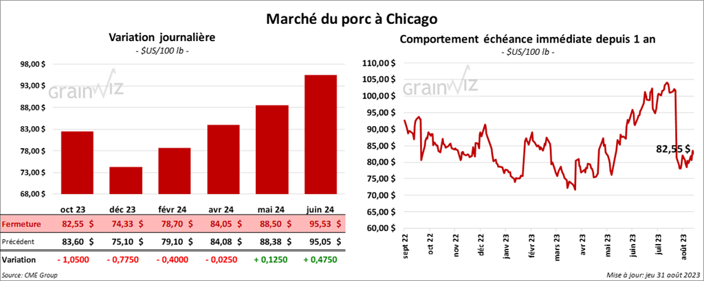Le contrat de porc US oct. 23 a clôturé à 82,55 $ (- 1,05 $). Celui déc. 23 a fermé à 74,33 $ (- 78 cents). Celui févr. 23 a terminé à 78,70 $ (- 40 cents).